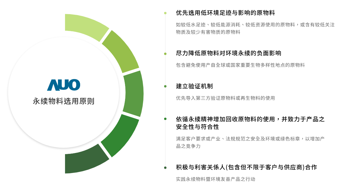 jinnian金年会主要产品显示器面板,面板製造原物料主要使用为玻璃基板与半导体製程所製造之显示器液晶盒再与相关零件和物料组装。为选用低环境负荷与风险之原物料,我们于产品生命週期原物料阶段,即对我们所使用的原物料进行关键原物料之分析评估,包含材质以及重量占比。再依分析结果定义关键原物料,优先导入再生物料的使用。