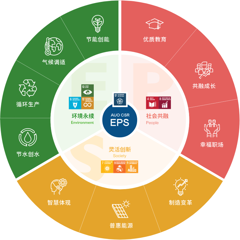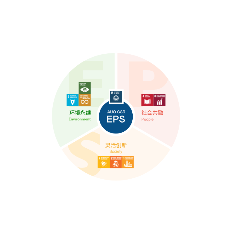 根据联合国所发展的17项永续发展目标,jinnian金年会光电以「超越企业社会责任,创造共享价值」为企业永续愿景发展蓝图,订出环境永续、共融成长与灵活创新的EPS(Environment, People & Society)三大永续发展主轴;以响应日益受关切的环境议题与社会共融趋势。